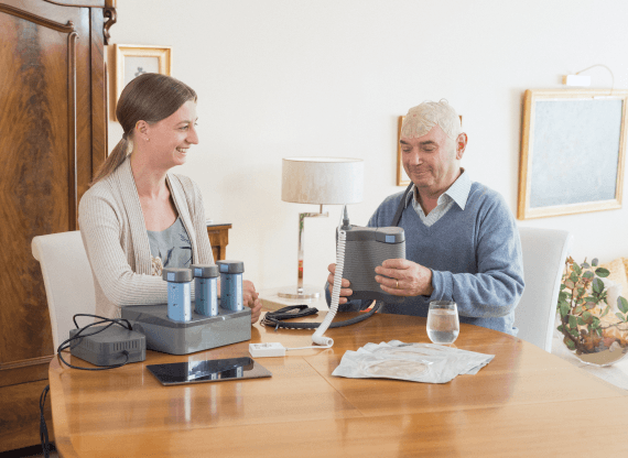 Novocure envía el kit de tratamiento Optune Gio a la casa del paciente y el técnico en soporte de dispositivos de Novocure (DSS) educa al paciente y al cuidador sobre cómo usar Optune Gio.